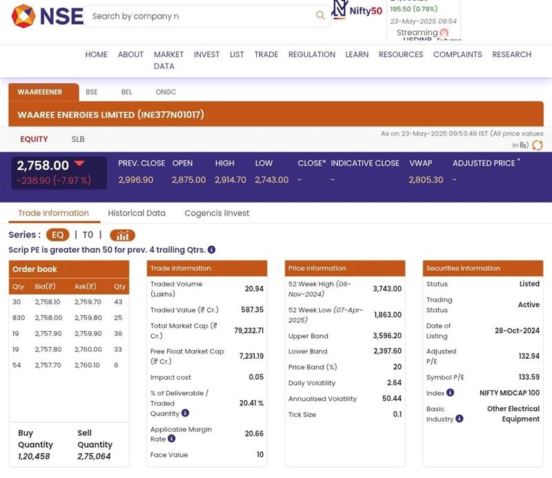 Waaree Energies Limited (NSE: WAAREEENER) stocks opened in the red today, May 23, soon after the Indian stock market opened for trading. According to the National Stock Exchange (NSE), shares of Waaree Energies (NSE: WAAREEENER) were trading at INR 2,758 and dropped by INR 238.90 or 7.97 per cent. Stocks To Buy or Sell Today, May 23, 2025: RBL Bank, Ultratech Cement, Jio Financial Among Shares That May Remain in Focus on Friday.