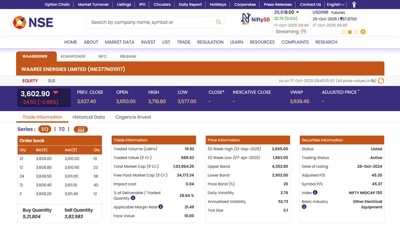 Shares of Waaree Energies Ltd (NSE: WAAREEENER) opened at INR 3,650.00 on Friday, October 17, up from the previous close of INR 3,627.40, but slipped to INR 3,602.90 by 9:45 AM, down 0.68% in early trade. The stock is trading below its 52-week high of INR 3,865.00, while the 52-week low stands at INR 1,863.00. Investor focus follows the company’s strong Q2 FY26 results, reporting a 130% YoY jump in net profit to INR 871 crore on total income of INR 6,226.54 crore. EBITDA surged 155.29% YoY to INR 1,567.30 crore, with margins improving to 25.17%, while production reached 2.64 GW in Q2. The company’s robust order book stands at around 24 GW, valued at INR 47,000 crore, and the board approved an interim dividend of INR 2 per share. Stocks to Buy or Sell Today, October 17, 2025: Infosys, Wipro and Jio Financial Among Shares That May Remain in Spotlight on Friday.