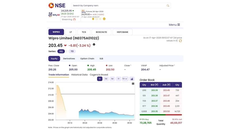 The Wipro Limited (NSE: WIPRO) share price opened in red on Friday, April 17, 2026. The Wipro (NSE: WIPRO) share price was trading at INR 203.45, down by INR 6.81 or 3.24%. The decrease in Wipro share price comes after the company’s Q4 FY26 results and subdued near-term guidance drew mixed reactions from brokerages.