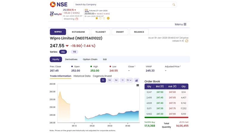 Shares of Wipro Limited (NSE: WIPRO) witnessed a low opening on Monday, January 19, 2026, trading at approximately INR 247.55 during the early morning session. Analysts suggest that the stock is finding support near its 50-day moving average as investors await further updates on the company's strategic expansion into AI-driven services. Trading volume remained moderate, with the stock maintaining a neutral to bullish outlook for the day’s session. Stocks to Buy or Sell Today, January 19, 2026: HDFC Bank, Wipro and Reliance Industries Among Shares That May Remain in Spotlight on Monday.