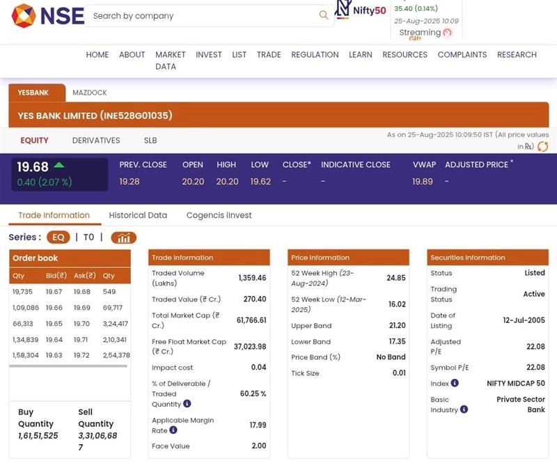 Yes Bank Ltd share price (NSE: YESBANK) gained 2.07% on Monday, August 25, trading at INR 19.68 on the NSE as of 10:16 AM IST. The stock rose INR 0.40 in intraday action, supported by positive investor sentiment. On August 23, Yes Bank announced that the Reserve Bank of India (RBI) had approved the Japanese banking giant’s acquisition of a significant minority stake. However, the central bank clarified that SMBC will not be designated as a promoter of Yes Bank after this transaction. Mazagon Dock Shipbuilders Share Price Today, August 25: Stock Rises Over 2.38% in Early Trade, Check Latest Price on NSE.