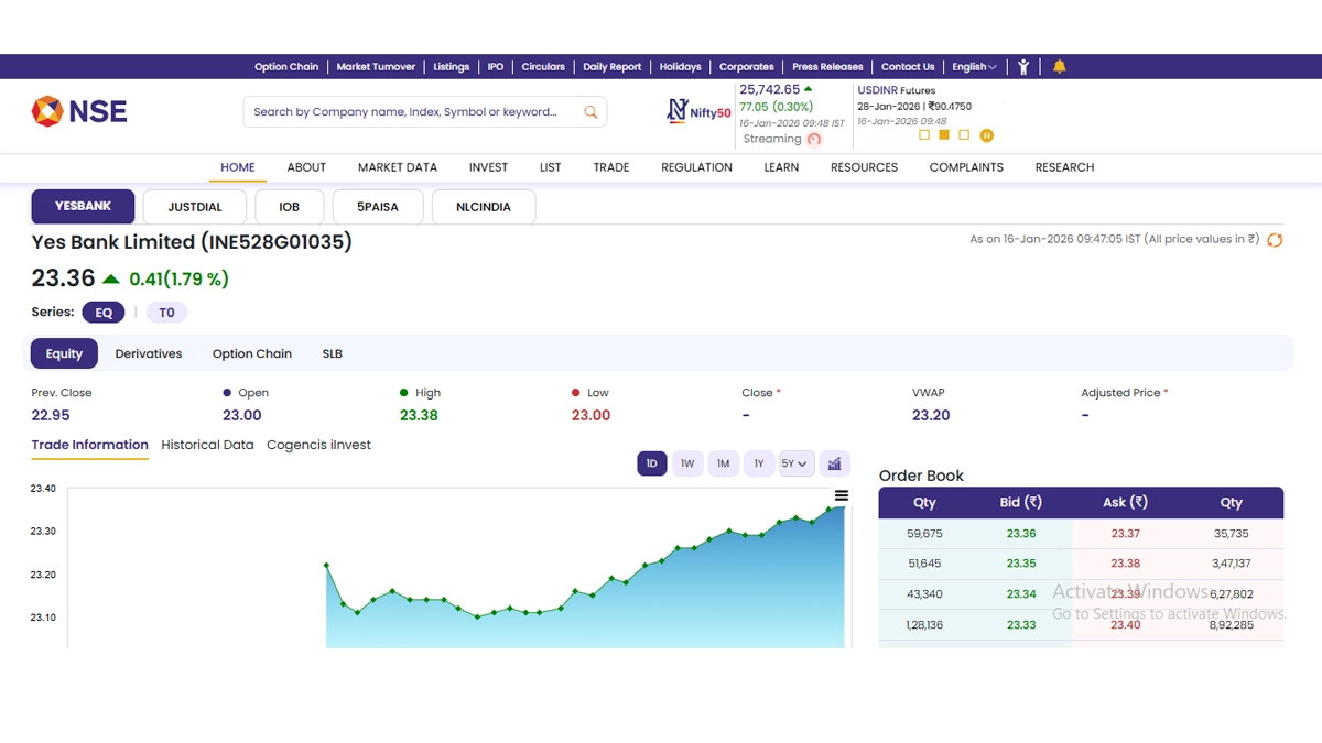 Shares of Yes Bank Limited (NSE: YESBANK) opened in the green today, January 16. As soon as the stock market opened for business, stocks of Yes Bank Limited (NSE: YESBANK) were trading at INR 23.36 and grew by INR 0.41 or 1.79 per cent. Notably, shares of Yes Bank Limited (NSE: YESBANK) saw their 52-week high and low of INR 24.30 and INR 16.02 on October 10, 2025 and March 12, 2025. Stocks to Buy or Sell Today, January 16, 2026: Infosys, Jio Financial and Transrail Lighting Among Shares That May Remain in Spotlight on Friday.