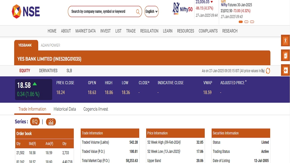 The stocks of Yes Bank Limited (NSE: Yes Bank) opened in green today, January 27, in early morning trade. According to the latest trading updates on the National Stock Exchange (NSE) website, Yes Bank Limited (NSE: Yes Bank) was trading at INR 18.58 and saw an increase of INR 0.34 or 1.86 per cent. Yes Bank Limited (NSE: Yes Bank) saw its 52-week high of INR 32.85 on February 9 last year. Stocks To Buy or Sell Today, January 27, 2025: ICICI Bank, IDFC First Bank, DLF Among Shares That May Remain in Spotlight on Monday.