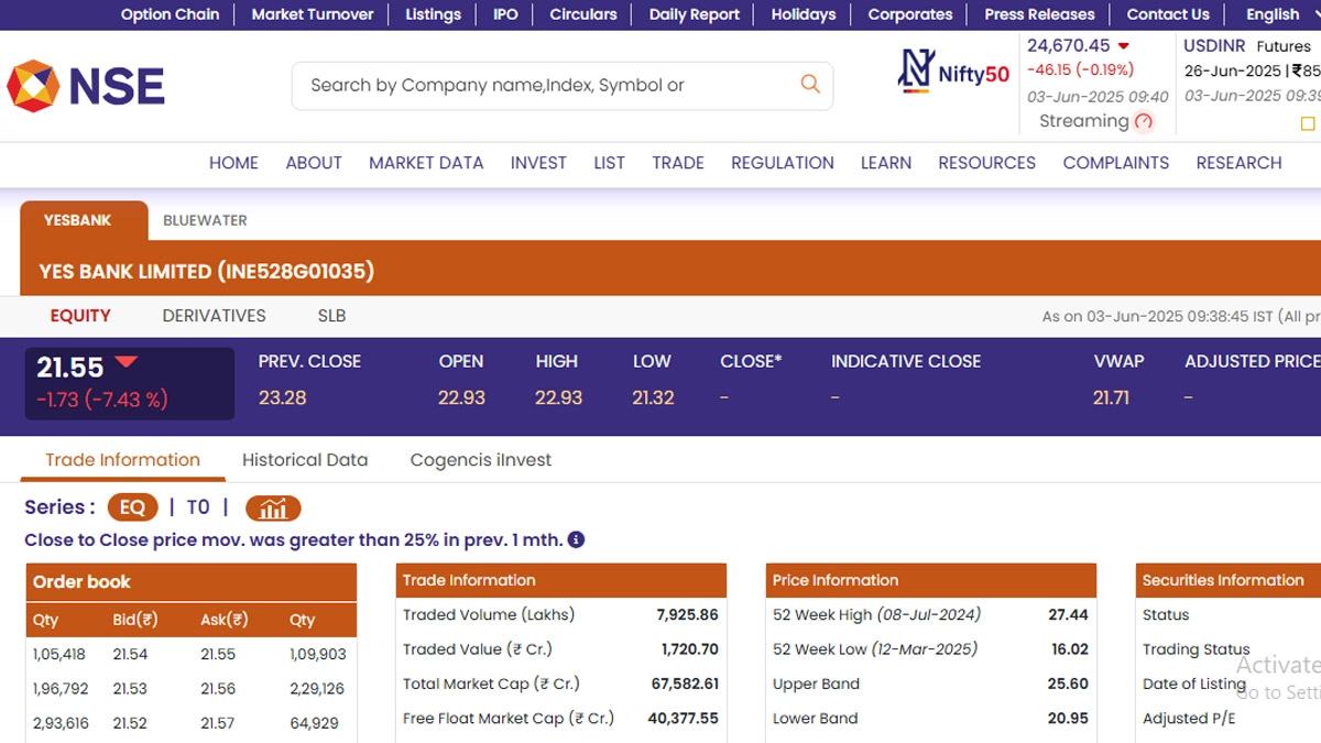 Stocks of Yes Bank Limited (NSE: YESBANK) opened in the red today, June 3, as the stock market opened for business. According to the latest stock market updates, Yes Bank Limited (NSE: YESBANK) shares were trading at INR 21.55 and fell by INR 1.73 or 7.43 per cent. Yes Bank Limited (NSE: YESBANK) saw its 52-week high of INR 27.44 on July 8, 2024 and 52-week low of INR 16.02 on March 12 this year. Stocks To Buy or Sell Today, June 03, 2025: Adani Group, HCLTech and Biocon Among Shares That May Remain in Spotlight on Tuesday.