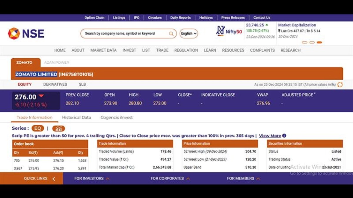The shares of Zomato Limited (NSE: Zomato) opened in negative today, December 23, in early morning trade. According to the latest trading updates on the National Stock Exchange (NSE), Zomato Limited (NSE: Zomato) was trading at INR 276 and saw a decline of INR 6.10 from the previous day's closing of INR 282.10. Dmart Most-valuable India Co Founded by Self-made Entrepreneur Post-2000; Zomato, Swiggy Next: Hurun.