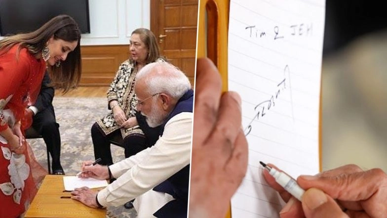 The Kapoor family is all set to celebrate the 100th birth anniversary of the legendary Raj Kapoor on December 14. The members of the Kapoor family, including Kareena Kapoor, Saif Ali Khan, Ranbir Kapoor, Karisma Kapoor and Reema Jain, among others, met Prime Minister Narendra Modi in Delhi and invited him to join the grand celebrations. Now, a video from their meeting featuring a light-hearted moment between PM Modi and the actors. In the clip, the honourable PM could be seen telling Sai Ali Khan, "Mai aapke pitaj (Mansoor Ali Khan Pataudi) ko mila hoon. Mai sochra that aaj mujhe aaj teen peedi ko milne ka mauka milega, lekin aap laye nahin teesri peedhi ko." (I have met your father and I thought maybe I could meet your family's third generation today, but you didn't bring your kids (Taimur Ali Khan, Jehangir Ali Khan). Responding to this, Kareena Kapoor replied, "We wanted to bring them". In a heartfelt gesture, PM Modi signed an autograph for Kareena Kapoor and Saif Ali Khan's kids Taimur and Jeh. Also, check Riddhima Kapoor Sahni's interaction with PM Modi below. Kareena Kapoor Khan Thanks PM Narendra Modi for Supporting Raj Kapoor’s Birth Centenary Celebrations, Says, ‘Your Support in Celebrating This Milestone Meant the World to Us’ (View Pics).
