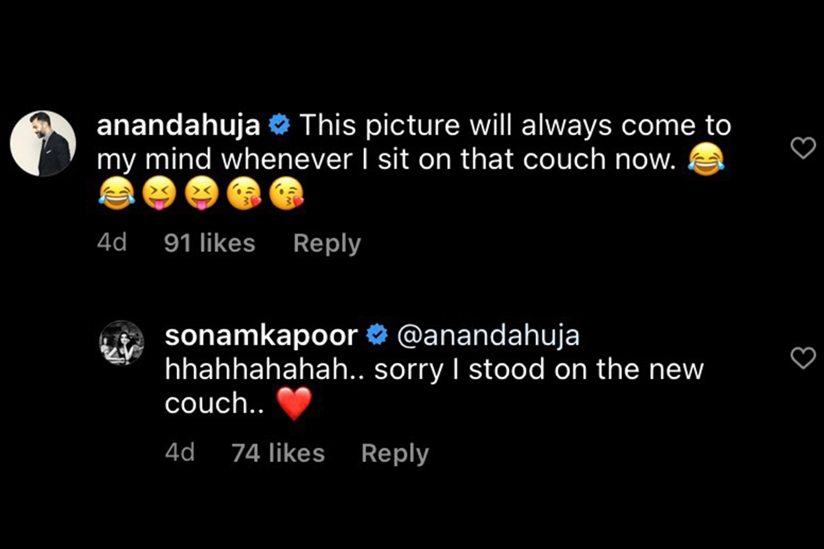 Sonam Kapoor recently shot for the cover of Architectural Digest India. In one of the photos from the shoot, the actress can be seen standing on a blue sofa. Anand Ahuja came across the photo and dropped a hilarious comment on her post.