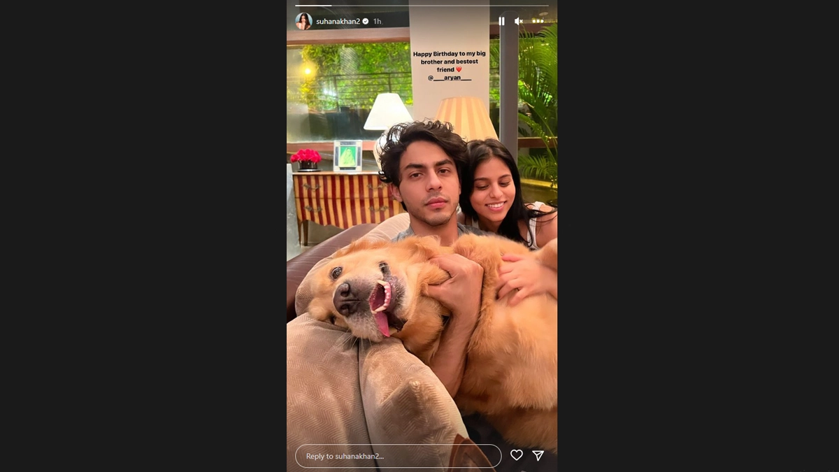 Suhana Khan took to Instagram stories and penned the sweetest birthday wish for her brother Aryan Khan. The Archies star shared an unseen pic of her and Aryan chilling with their pet dog while wishing Aryan on his 25th birthday. Isn't that cute? Suhana Khan and Khushi Kapoor Pose With Co-Star Tara Sharma on Sets of The Archies (View Pic).