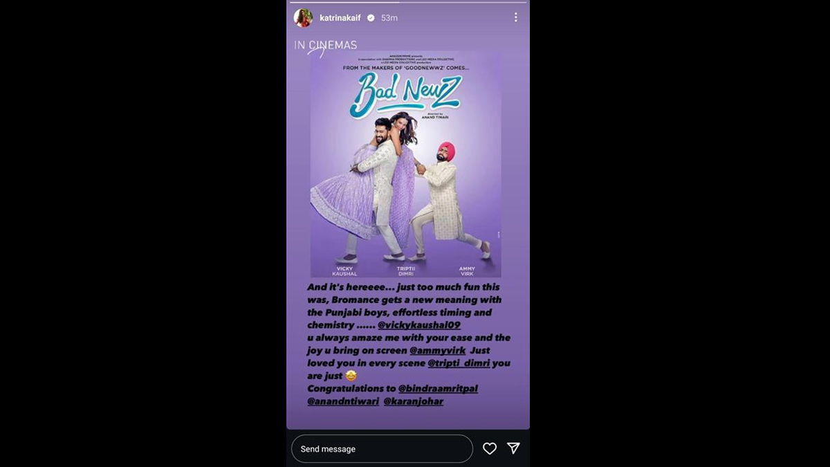 Katrina Kaif, not just a top actress and loving wife but also Vicky Kaushal’s staunch supporter, recently attended the special screening of his latest film Bad Newz. Co-starring Triptii Dimri and Ammy Virk, the rom-com explores a woman's journey after becoming pregnant with twins. Sharing her review, Katrina applauded Bad Newz, praising the chemistry between Vicky and Ammy and Triptii's performance. Her enthusiastic endorsement highlights her dual role as both a devoted partner and a discerning critic. She wrote, “And it's hereeee... just too much fun this was, Bromance gets a new meaning with the Punjabi boys, effortless timing and chemistry.... @vickykaushal09 is u always amaze me with your ease and the joy u bring on screen @amy_virk_official loved you @tripti_dimri you are just Congratulations to @bindraamritpal @anandntiwari @karanjohar.” ‘Bad Newz’: Sushmita Sen’s Daughter Renée Sen Feels Grateful To Work As Intern AD in Vicky Kaushal and Triptii Dimri's Comedy Film (See Pics).