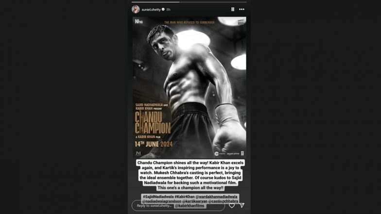 Kartik Aaryan's much-anticipated film Chandu Champion has finally hit the big screens today (June 14). The early reaction shows that the biographical drama helmed by Kabir Khan has been received well by the audience and critics alike. Now, Suniel Shetty has shared his take on Chandu Champion by posting on his social media. Taking it to his Instagram handle, Suniel shared a poster of Kartik Aaryan and director Kabir Khan for their work. He also praised producer Sajid Nadiadwala and casting director Mukesh Chhabra. He wrote, "Chandu Champion shines all the way! Kabir Khan excels again, and Kartik's inspiring performance is a joy to watch. Mukesh Chhabra's casting is perfect, bringing the ideal ensemble together. Of course, kudos to Sajid Nadiadwala for backing such a motivational film. This one's champion all the way!" Chandu Champion Movie Review: Kartik Aaryan is Strictly Satisfactory in Kabir Khan's Over-Long, Overtly Formulaic Biopic (LatestLY Exclusive).