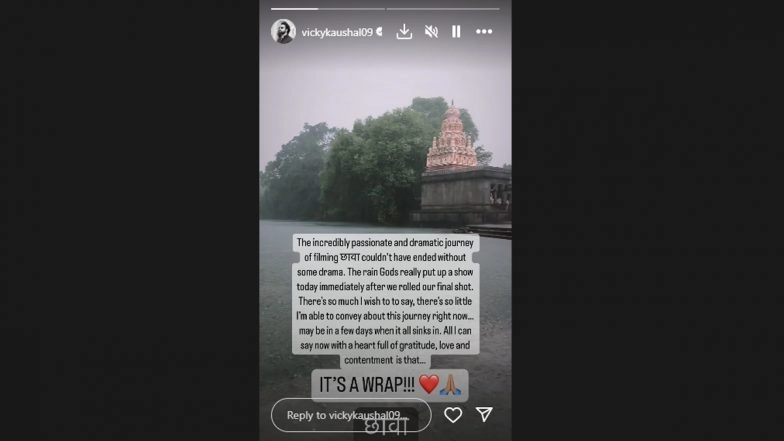 Vicky Kaushal, who will soon captivate audiences with his period drama Chhaava, has shared that he has wrapped filming for the film. Taking to his Instagram stories on May 11, Vicky poured out his emotions as he bid farewell to the sets of Chhaava. He wrote, "The incredibly passionate and dramatic journey of filming Chhaava couldn't have ended without some drama. The rain Gods really put up a show today immediately after we rolled our final shot. There's so much I wish to say, there's so little I'm able to convey about this journey right now...may be in a few days when it all sinks in. All I can say now is a heart full of gratitude, love and contentment is that... IT'S A WRAP!!!" Chhaava is directed by Laxman Utekar and stars Rashmika Mandanna alongside Vicky Kaushal. Chhaava Leaked BTS Pics: Vicky Kaushal Spotted Shooting In Dhoti, Sleeveless Kurta and Rudraksha Mala For His Upcoming Film!.