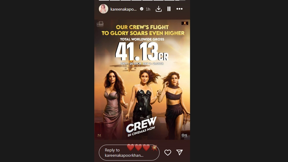 The Crew team is elated as the film enjoys remarkable success at the box office, amassing Rs 41.13 crore globally in just two days, with a notable surge on the second day. The weekend has significantly bolstered the film's performance. Ektaa Kapoor recently shared a video updating fans on the achievement, captioning it, "The sky’s the limit! Join our crew as we soar to greater glory!" Crew is a female-centric heist comedy starring Kareena Kapoor Khan, Tabu, and Kriti Sanon. It also features Diljit Dosanjh and Kapil Sharma in pivotal roles. Kareena has also celebrated the achievement by Sharing the video on her Instagram stories. Domestically, Crew has raked in an impressive total of Rs 21.15 crore, marking substantial growth on day two. Crew Box Office Collection Day 2: Kareena Kapoor Khan, Tabu and Kriti Sanon’s Heist Comedy Film Earns Rs 21.15 Crore in India!