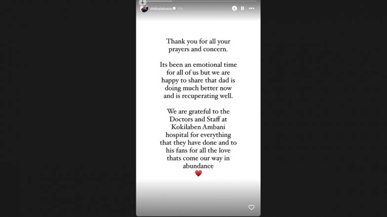 Veteran actor Tiku Talsania recently faced a serious health scare when he suffered a brain stroke. Initially, in a critical condition, the actor's fans and the film industry were understandably worried. However, in a hopeful turn of events, Tiku is now on the mend. His daughter, Shikha Talsania, took to Instagram today to share a positive update on her father's recovery, easing the concerns of many who hold him dear. She said, "Thank you for all your prayers and concern. It’s been an emotional time for all of us but we are happy to share that dad is doing much better now and is recuperating well. We are grateful to the Doctors and Staff at Kokilaben Ambani hospital for everything that they have done and to his fans for all the love that’s come our way in abundance." Tiku Talsania Health Update: Rashami Desai Confirms Veteran Actor Is Doing ‘Better’ After Hospitalisation for Brain Stroke.