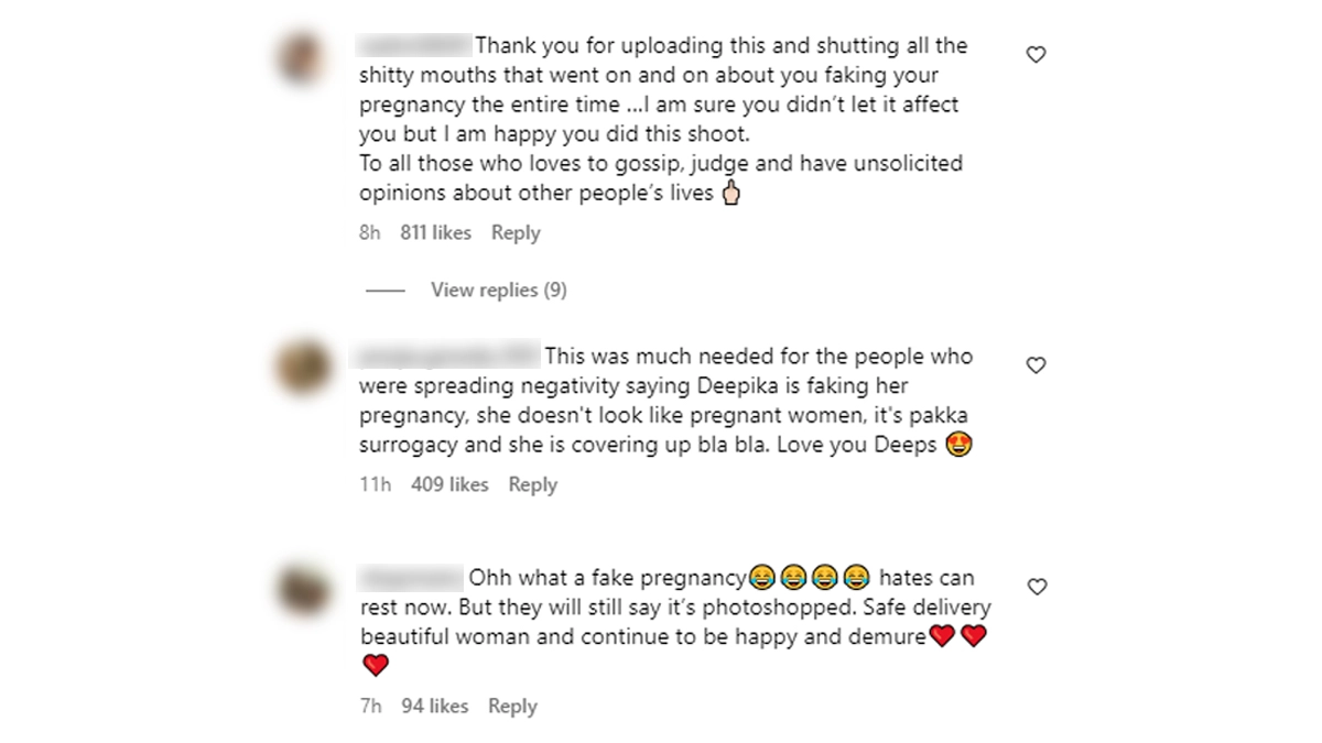 Deepika Padukone and Ranveer Singh are eagerly awaiting the arrival of their first child, with the actress reportedly due this month. Yesterday, the mom-to-be shared a series of monochrome maternity photoshoot pics featuring her husband and showcasing her blossoming baby bump for the first time since announcing their pregnancy. In one of the photos, she poses confidently in a black lace bralette and matching suit, turning heads with her stylish maternity fashion. She also stuns in a sheer black dress, elegantly highlighting her baby bump. This reveal came amid rumours suggesting that Padukone might be faking her pregnancy or using a surrogate, claims that neither she nor Ranveer have publicly addressed. The photos have effectively dispelled these speculations. In response, Padukone’s fans have come to her defense, condemning the negativity and baseless accusations. One fan commented, “This was much needed for the people who were spreading negativity saying Deepika is faking her pregnancy, she doesn't look like pregnant women, it’s pakka surrogacy and she is covering up bla bla.” Deepika Padukone Shows Off Baby Bump in Maternity Photoshoot; Katrina Kaif, Priyanka Chopra and Others React to the Stunning Monochrome Pics.