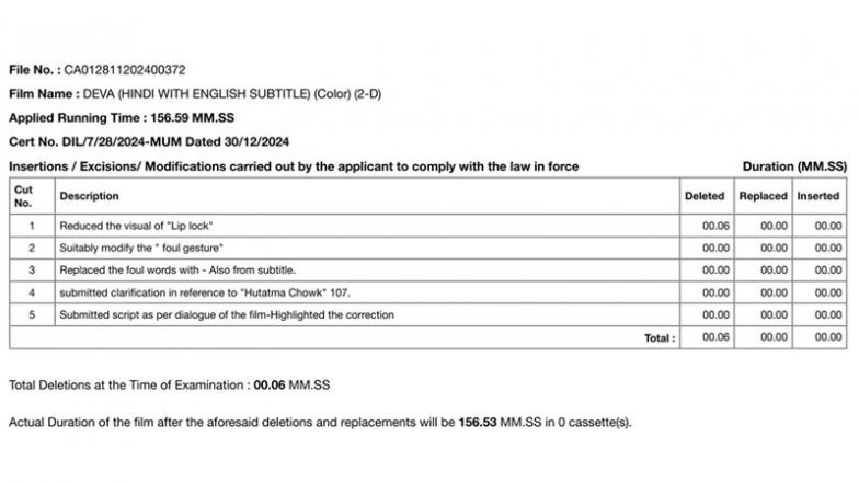 Shahid Kapoor's Deva is one of the most highly anticipated films this January. Directed by Rosshan Andrrews, the movie is set to release in theatres on January 31. Alongside Shahid, actress Pooja Hegde will star opposite him. Ahead of the film's release, it has been revealed that a six-second lip-lock scene has been removed, as shared by a user on X (formerly known as Twitter), Aroon Deep. The post also mentions that certain foul language and gestures have been cut by the Central Board of Film Certification (CBFC). Additionally, the running time of the movie is confirmed to be 156 minutes and 59 seconds. ‘Deva’: A Week Ahead of Shahid Kapoor-Starrer’s Release, Makers Share an Exciting Countdown Glimpse of the Movie (Watch Video).