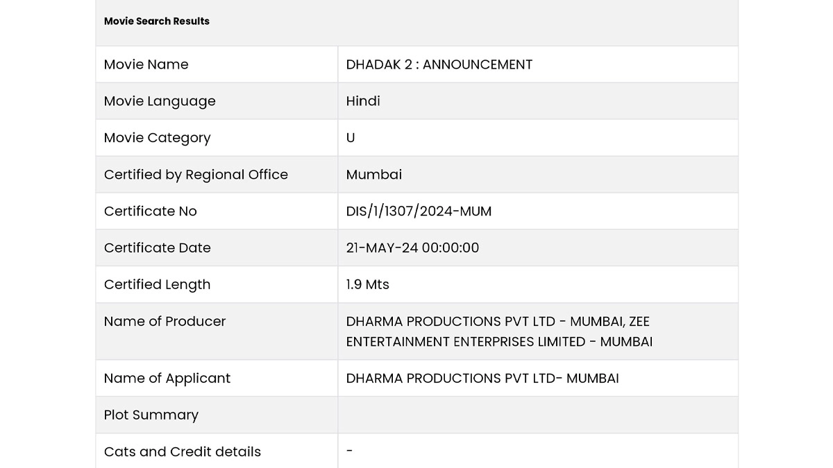 Dhadak 2 Deets on CBFC’s Official Site