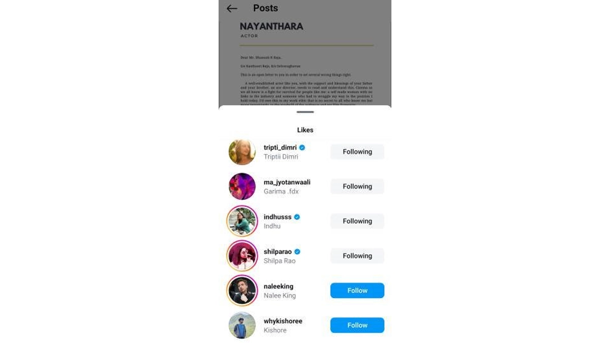 Amid the ongoing legal dispute between Nayanthara and Dhanush over the usage of Naanum Rowdy Dhaan footage in the actress's Netflix documentary, Nayanthara: Beyond The Fairy Tale, several celebrities have come forward to show their support for the Lady Superstar. The controversy began when Dhanush issued a legal notice seeking INR 10 crore in damages, prompting Nayanthara to respond with a bold open letter that criticised his actions. This letter has garnered attention on social media, with stars like Bhool Bhulaiyaa 3 actress Triptii Dimri and Jawan singer Shilpa Rao showing their support by liking her post on Instagram. They were joined by other notable figures, including Dia Mirza, Isha Talwar, Parvathy Thiruvothu and Shruti Haasan, all expressing their support for Nayanthara amid the controversy. Nayanthara-Dhanush Controversy: Anupama Parameswaran, Nazriya Nazim and Parvathy Thiruvothu Offer Their Support to Lady Superstar Amid Legal Dispute.