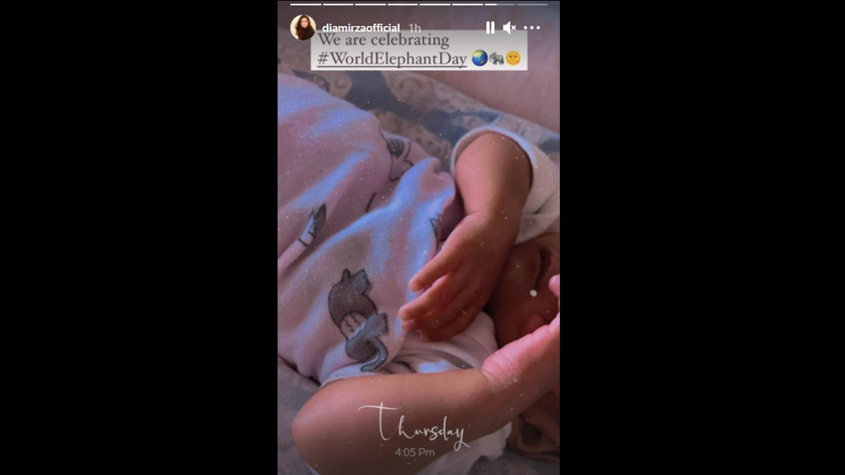 Dia Mirza is celebrating World Elephant Day 2021 with her son Avyaan. The actress took to Instagram stories and shared a first-ever pic of the little one dressed in a cute onesie. Mommy and son are indeed having a good time.