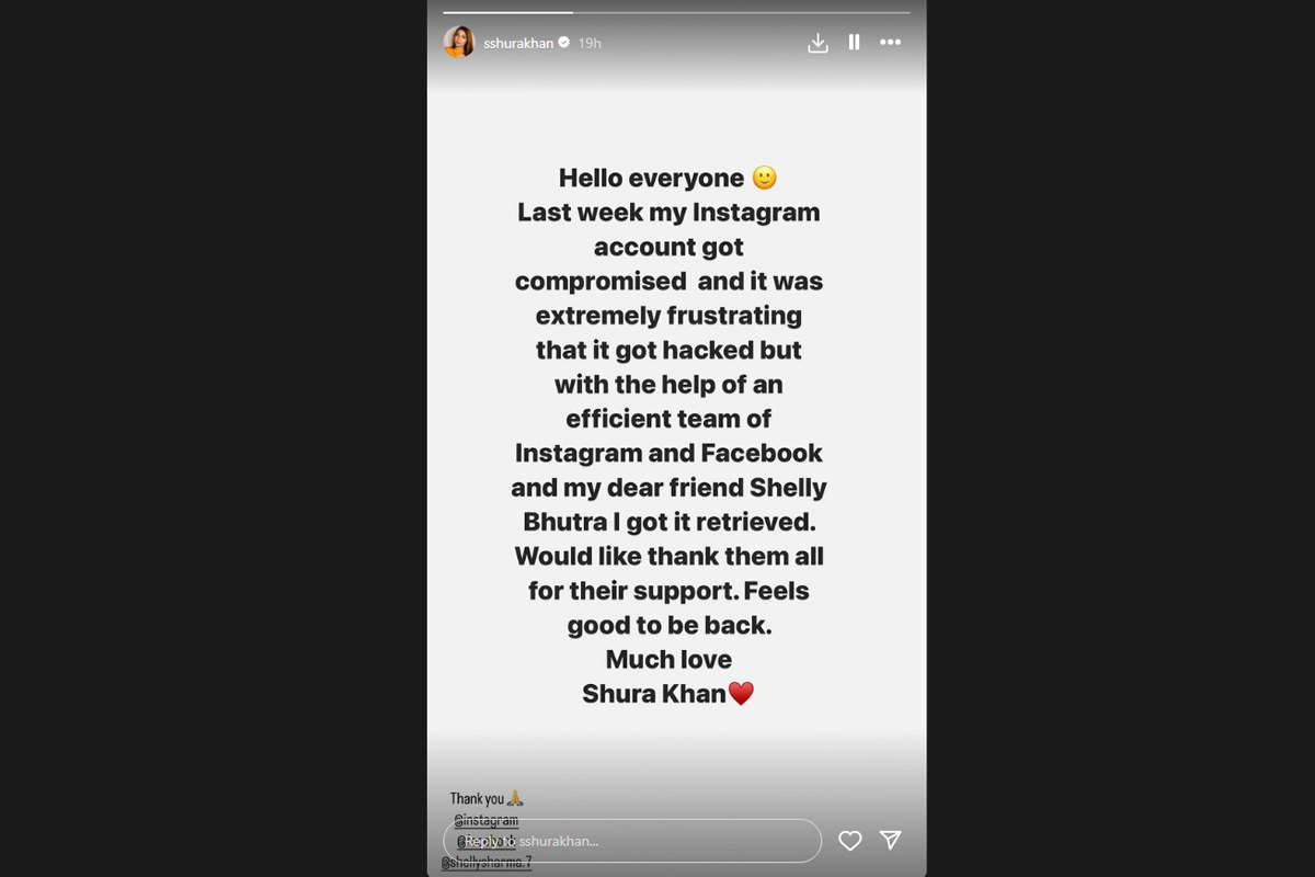 In a recent update on her Instagram story, Arbaaz Khan's wife, Sshura Khan, disclosed that her account had been hacked. She expressed her frustration at the incident and thanked the Facebook and Instagram teams, as well as her friend Shelly Bhutra, for their support in regaining control of her account. The message concluded with a note of gratitude and love from Sshura Khan to those who helped her. Check her post below! Arbaaz Khan and Sshura Khan Are Married! Actor Shares FIRST Pics, Writes ‘Me and Mine Begin a Lifetime of Love and Togetherness’.