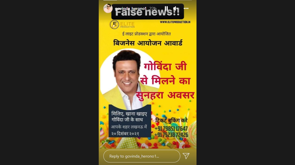 Govinda has warned his fans against a fake poster that has been doing rounds on the internet suggesting that there is a meet-greet event scheduled on December 20 in Lucknow featuring the actor. He shared the advert on Instagram stories and clarified that it's 'False News'. The poster sees a picture of the star along with mentioning that it's a golden opportunity to meet Govinda. It also mentions ticket booking details and phone numbers. Check it out below.