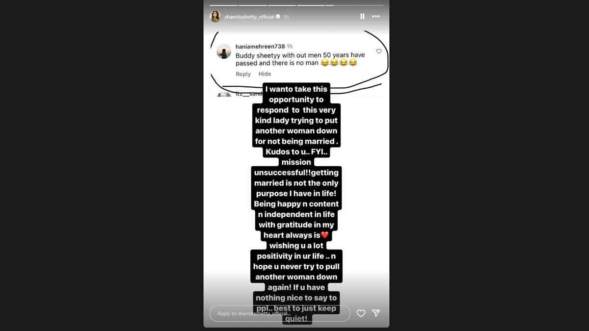 Mohabbatein actress Shamita Shetty is yet to find her life partner despite being in her 40s. Her relationship with Raqest Bapat made headlines during Bigg Boss OTT, but they later broke up. A female internet user recently criticised Shamita for her single status, calling her "buddhi." However, the actress responded confidently, stating she's happy and content being single and independent. She focused on positivity and said the troll's attempt to demean her failed. She also hoped the troll would refrain from putting down other women and urged her to stay silent if she had nothing nice to say. Check Shamita's response below! Rani Mukerji–Aditya Chopra’s Daughter Adira Turns 8! Shilpa Shetty Kundra Shares Pics From the Star Kid’s Christmas-Themed Birthday Celebration.
