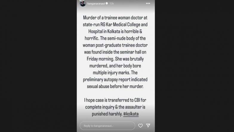 The whole nation has been shocked by the horrifying rape and murder case of a trainee doctor at Kolkata's RG Kar Medical College and Hospital. Now, actress and BJP MP Kangana Ranaut has reacted to the inhumane incident and demanded a CBI enquiry into the case. Taking to her Instagram stories on Tuesday, Kangana demanded justice for the deceased and penned a long note. She wrote, "Murder of a trainee woman doctor at state-run RGKar Medical College and Hospital is horrible and horrific. The semi-nude body of the woman post-graduate trainee doctor was found inside the seminar hall on Friday morning. She was brutally murdered and her body bore multiple injury marks." She later demanded justice for the victim and went on to say, "I hope case is transferred to CBI for the inquiry & the assaulted is punished harshly." The incident took place on Friday (August 9) and the accused has been identified as Sanjay Roy who worked as a civic volunteer for Kolkata police. Kolkata Doctor Rape-Murder Case: Elvish Yadav Requests PM Modi for CBI Enquiry Into the Case, Demands Justice (View Post).