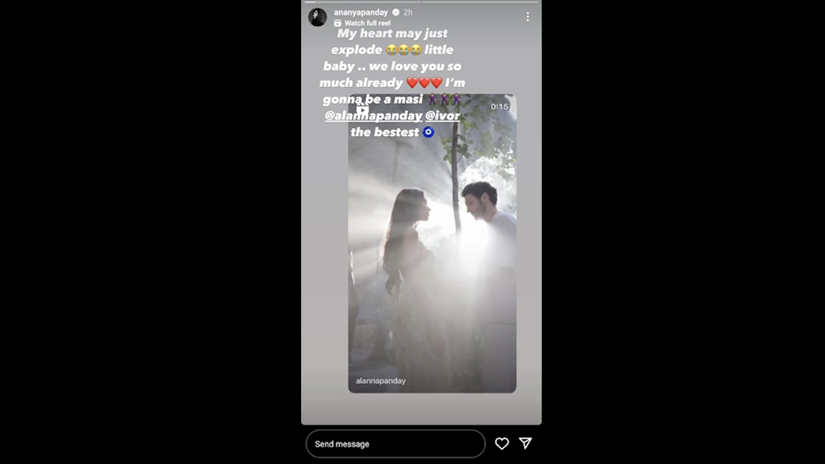 Ananya Pandey is delighted upon hearing the news of her cousin's sister Alanna Panday's pregnancy. The expectant mother shared a video on Instagram, which Ananya promptly re-shared on her Instagram Stories, expressing her eagerness to meet the baby. Tagging the couple, Ananya's heartfelt message exudes her overflowing love for the little one, anticipating her role as a Masi (aunt) with enthusiasm and affection, conveying her utmost excitement and affection for the upcoming addition to the family. Ananya Panday's Cousin Alanna Panday Expecting First Child With Husband Ivor McCray; Couple Announces Pregnancy With Cute Maternity Video.