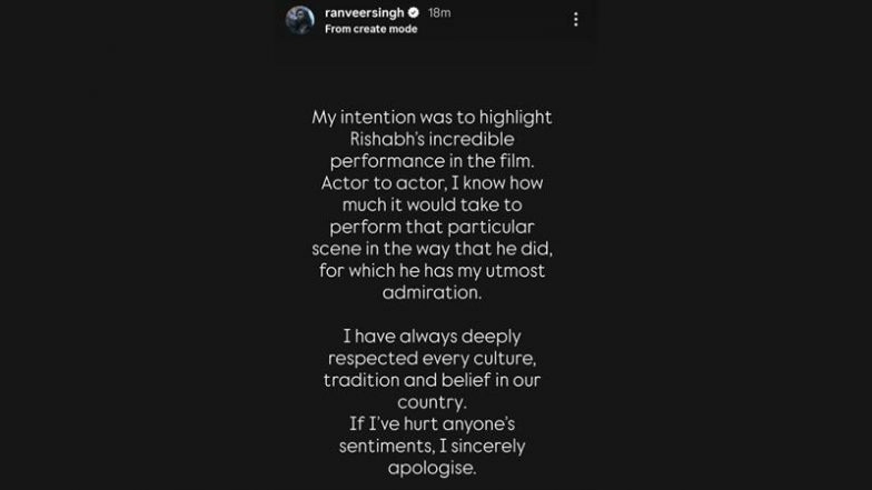 Bollywood star Ranveer Singh sparked major controversy after his recent appearance at the International Film Festival of India (IFFI) closing ceremony in Goa. The incident occurred when Ranveer lauded Kantara 2 star Rishab Shetty’s performance in the mythological thriller and mimicked his character from the film, which drew severe backlash online. "My intention was to highlight Rishab's incredible performance in the film. Actor to actor, I know how much it would take to perform that scene in a particular way that he did, for which he has my utmost admiration. I have always deeply respected every culture, tradition and belief in our country. If I've hurt anyone's sentiments, I deeply apologise." His apology comes after the Hindu Janajagruti Samiti (HJS) filed a police complaint against Ranveer for insulting Goddess Chamundadevi by describing the deity in a derogatory manner." Ranveer Singh Faces Backlash for Mimicking Kantara Scene and Calling Daiva a ‘Female Ghost’ at IFFI 2025; Rishab Shetty Asked Him To Stop (Watch Video).