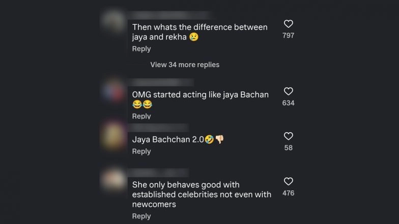 Veteran Bollywood actress Rekha is known for her timeless grace and kind nature. However, the veteran actress has been grabbing headlines for all the wrong reasons lately. Several videos of Rekha pushing a fan away who wanted to take a picture with her at the airport have gone viral. On Monday (December 8), Rekha was spotted at the Mumbai airport, exiting the terminal in her usual happy mood. A female fan hoping to click a selfie rushed toward her with her phone. The actress gently pushed her away, denying the picture. Despite the incident, Rekha maintained her smile and waved at the paparazzi as she made her way to her car. Netizens reacting to the video were deeply upset by Rekha's gesture and labelled her “Jaya Bachchan 2.0.” Reacting under a post carrying the incident, a user wrote, "Then what's the difference between Jaya (Bachchan) and Rekha?" Another wrote, "Jaya Bachchan 2.0". ‘She Reeks of Snobbish Elitism’: IFTDA President Ashoke Pandit SLAMS Jaya Bachchan’s Harsh Remarks About Paparazzi, Says Actress Demeaned Their Profession (View Post).