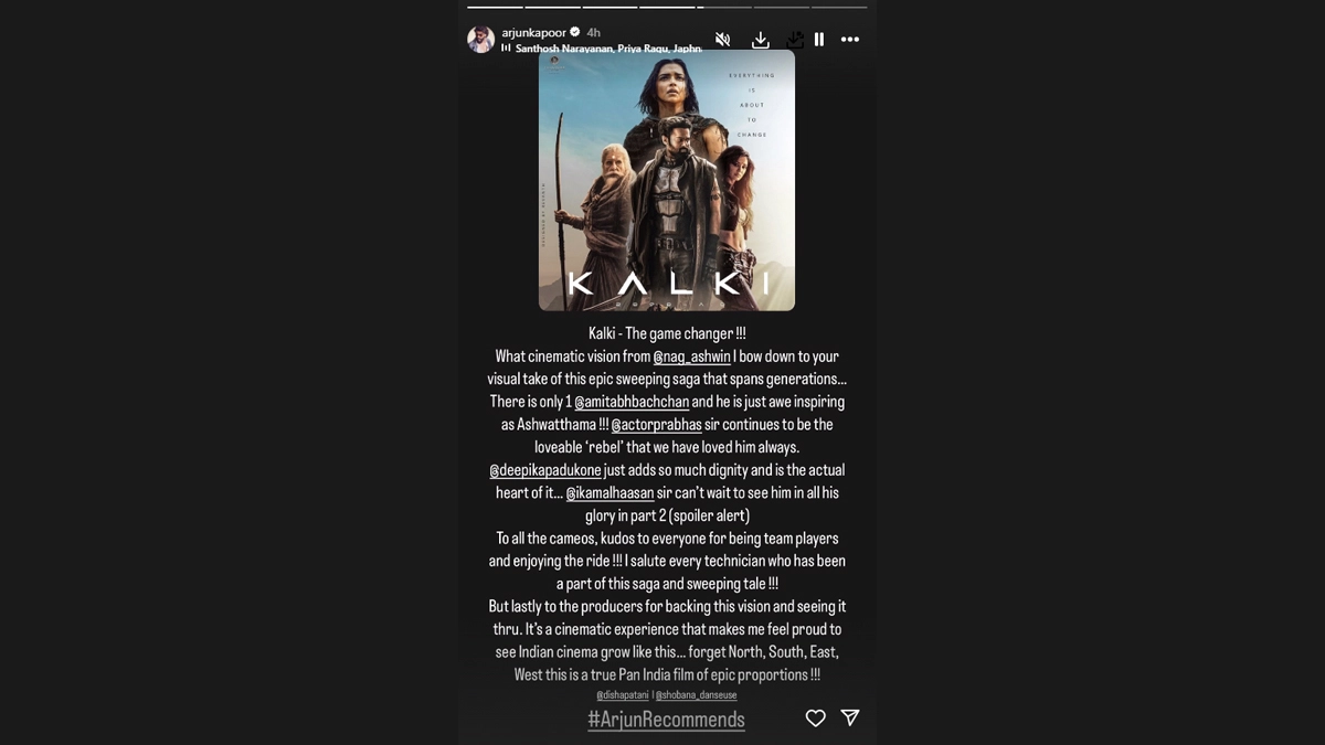 Nag Ashwin's sci-fic epic Kalki 2898 AD released in the cinemas on June 27, has been winning hearts worldwide. The mythological film stars Prabhas, Amitabh Bachchan, Deepika Padukone, Kamal Hasaan and Disha Patani in key roles. From Allu Arjun to SS Rajamouli, several celebrities who watched the film have showered praise for it. Today, Bollywood actor Arjun Kapoor also reviewed the film and shared his thoughts. Taking to his Instagram stories, the actor shared a poster of the film and wrote, "Kalki- The game changer! What a cinematic vision from @nag_ashwin I bow down to your visual take of this epic sweeping saga that spans generations...There is only 1 @amitabhbachchan and he is just awe-inspiring as Ashwatthama!" He then praised Prabhas, Deepika Padukone and Kamal Haasan for their performances. He concluded by saying, "It is a cinematic experience that makes me feel proud to see Indian cinema grow like this...forget North, South, East, West...this is a true Pan-Indian film of epic proportions!" Deepika Padukone re-shared Arjun Kapoor's Instagram story and replied with a heart sign. ‘Kalki 2898 AD’ Box Office: Has Prabhas-Starrer Inflated Its Global Collections? Trade Analysts Claim Producers’ Figures Much Higher Than Actual Numbers!.
