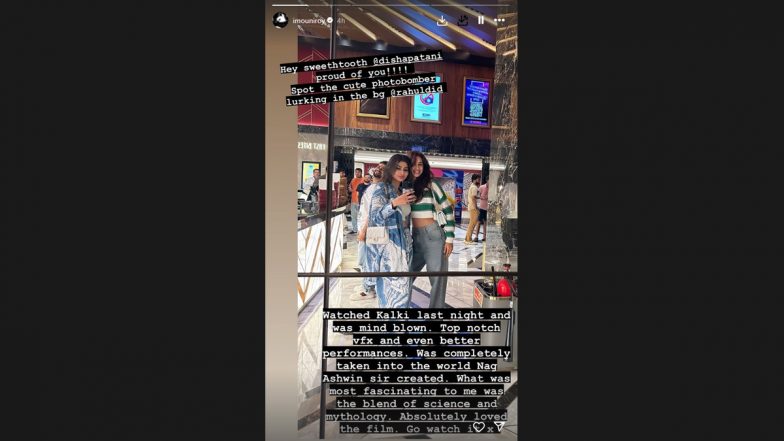 Nag Ashwin's directorial Kalki 2898 AD has finally been released worldwide on Thursday (June 27) amid much anticipation. The mythological sci-fi, reportedly made at a budget of INR 600 crore, features an ensemble cast of Prabhas, Amitabh Bachchan, Deepika Padukone, Kamal Haasan and Disha Patani, among others, in key roles. The film has been receiving positive response from both audiences and critics. Now, Mouni Roy, who is a close friend of Disha Patani, has shared her thoughts regarding the film. Taking to her Instagram stories on Friday, June 28, Mouni shared a picture with Disha from the film's screening and penned her thoughts. Showering praise on her bestie, she wrote, "Hey sweet tooth @dishapatani proud of you!" She added, "watched Kalki last night and was mind blow. Top-notch VFX and even better performances. Was completely taken into the world Nag Ashwin Sir created. What was most fascinating to me was the blend of science and mythology. Absolutely loved the film. Go watch it." 'Kalki 2898 AD' Box Office Collection Day 1: Prabhas-Deepika Padukone's Sci-Fi Saga Earns INR 191.5 Crore Globally.