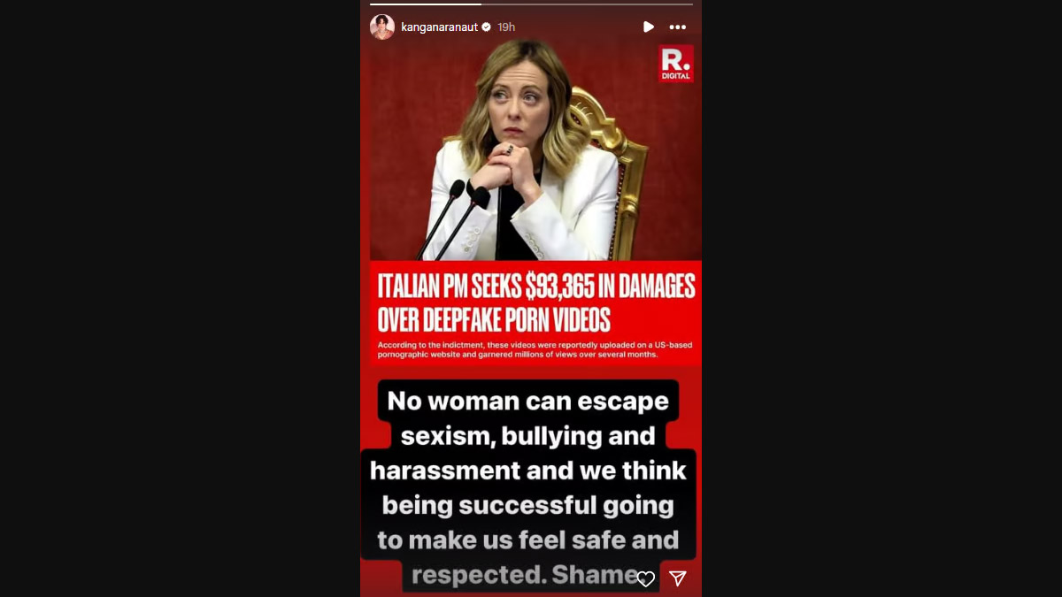 Kangana Ranaut recently shared her thoughts on the issue of online harassment and sexism linked to Italian Prime Minister Giorgia Meloni, who is seeking nearly Rs 90 lakh in damages over deepfake porn videos. Ranaut took to her Insta story and wrote, "We think being successful going to make us feel safe and respected. Shame." FYI, Meloni has reportedly gone the legal way in seeking damages over a series of deepfake pornographic clips of her which were leaked in 2020. She is scheduled to provide testimony in a court over the same in Italy on July 2. Giorgia Meloni Deepfake Porn Videos Uploaded on Internet, Italy PM Seeks Over USD 100,000 From Accused Father-Son Duo in Damages.