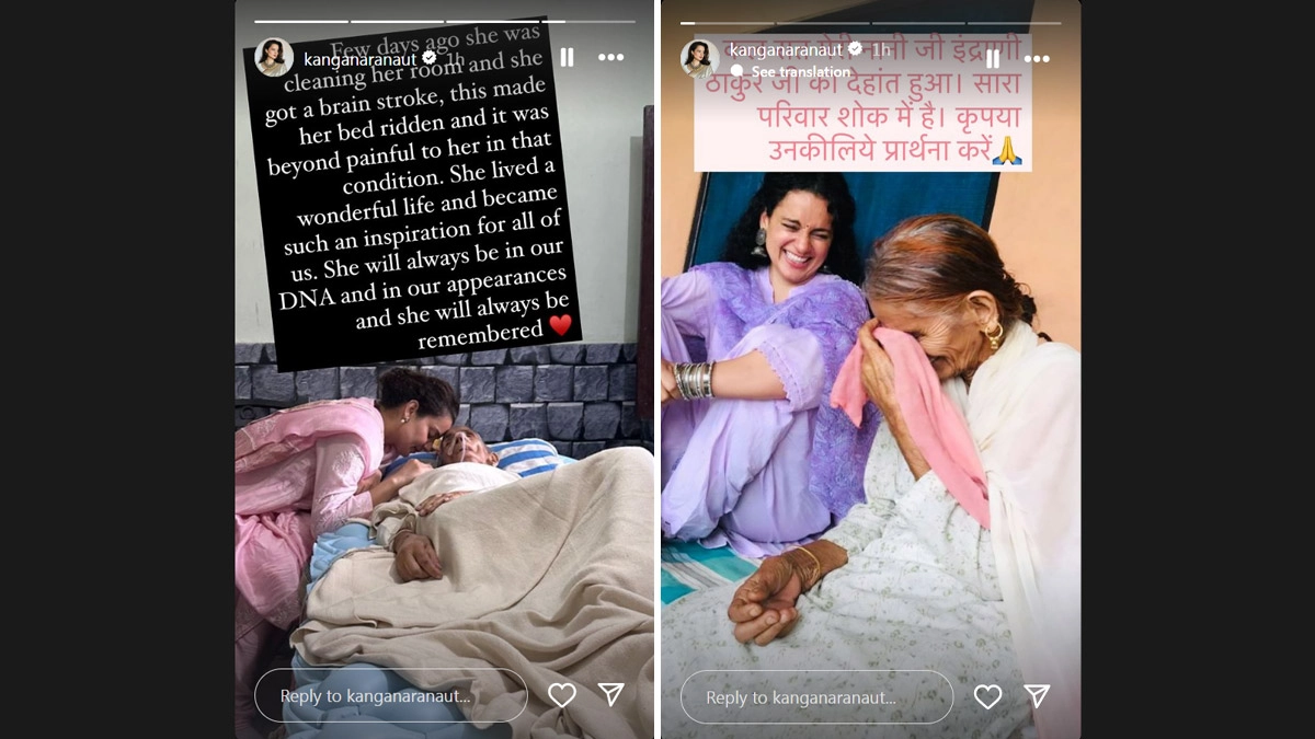 Kangana Ranaut shared the heartbreaking news of her grandmother’s passing on Instagram. In a heart-wrenching post, she wrote, “Kal raat meri nani Indrani Thakur Ji ka dehant hua. Saara parivar shok mein hai. Kripya unke liye prarthna kare.” (Last night, my grandmother Indrani Thakur Ji passed away. The entire family is in grief. Please pray for her.) The Emergency actress further revealed that her grandmother had been bedridden after suffering a brain stroke and was over "100 years old". She expressed her deep sorrow and asked for prayers for her late grandmother’s soul. Kangana Ranaut Congratulates Donald Trump on 2024 US Presidential Election Win, Blames ‘Clowns’ Taylor Swift, Beyoncé and Other Celebs for Kamala Harris’ Defeat.