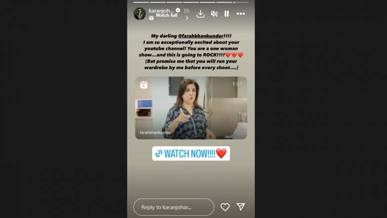 On Monday, April 15, filmmaker-choreographer Farah Khan, renowned for her delectable culinary creations coveted across the industry, delightedly unveiled her new YouTube channel via Instagram. Farah announced that she has finally started her own YouTube channel, which is all about food, friends, and fun. Sharing a reel on her Instagram, Farah Khan said she will share her famous Yakhni Pulao recipe in the first video. Later, Karan Johar, who is good friends with Farah Khan, took to his Instagram story and re-shared Farah Khan's video and wrote, "My darling @farahkhankunder! I am so exceptionally excited about your YouTube channel! You are a one-woman show, and this is going to rock!". As close buddies, there had to be a twist in this. Karan Johar added, "But promise me that you will run your wardrobe by me before every shoot." Will Farah Khan agree with Karan Johar's terms and conditions? Keep an eye on Farah's new channel to know. Mr and Mrs Mahi: Rajkummar Rao and Janhvi Kapoor Cheer for Team India Donning the Number 7 Jersey in New Poster From Karan Johar’s Upcoming Sports Film (See Pic).