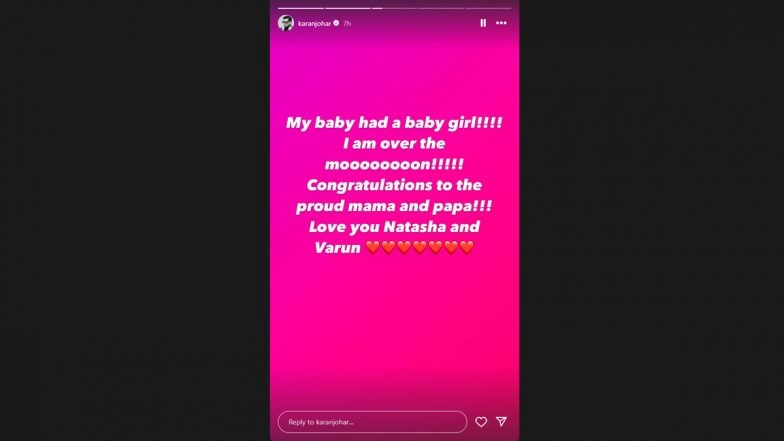 Varun Dhawan and his wife Natasha Dalal have been blessed with a baby girl! The couple welcomed their first child on June 3 at the Hinduja Hospital in Mumbai. The news was confirmed by Varun's father, filmmaker David Dhawan, while responding to the paparazzi. Just after the news broke, wishes started pouring in for the new parents. Karan Johar also extended warm wishes to the couple. Taking to his Instagram stories, Karan shared a heartfelt message and congratulated the couple on the arrival of their baby. He wrote, " My baby had a baby girl!!! I am over the moon!!! Congratulations to the proud mam and papa!!! Love you, Natasha and Varun." ‘It’s a Baby Girl’: Varun Dhawan and Wife Natasha Dalal Welcome First Child Together, David Dhawan Confirms.