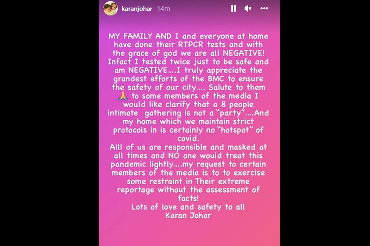 Karan Johar got his Covid-19 test after his close friend and actress, Kareena Kapoor Khan tested positive for the virus. The filmmaker took to Instagram stories to share that he got his results back and has tested negative. He added that he got his test done twice to be sure that he has not contracted the virus. Karan's family also tested negative for the virus.
