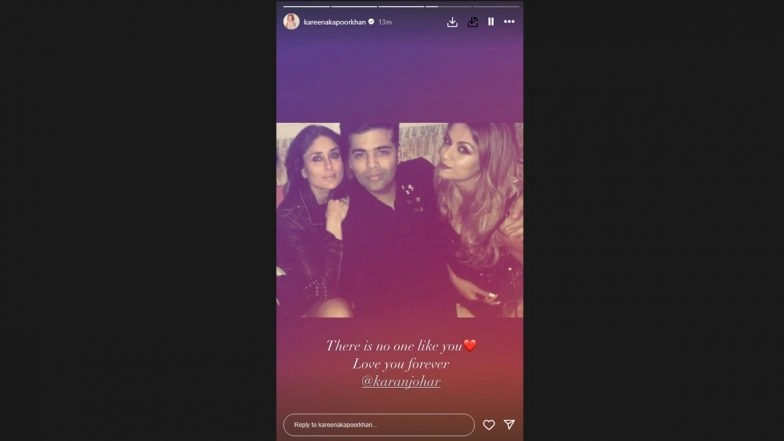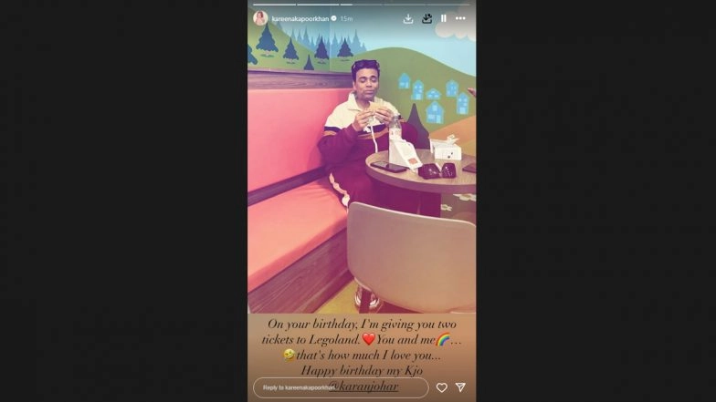 As Karan Johar celebrates his 52nd birthday today, the filmmaker has received some of the most heartwarming wishes from his industry close friends. Now, Kareena Kapoor Khan also took a trip down memory lane and shared unseen photos with him and wished him on his special day. Kareena Kapoor took to her Instagram handle to share two pictures of the actor. In one, the filmmaker is seen enjoying some snacks, with the caption, "On your birthday, I am giving you two tickets to Legoland. You and me, that's how much I love you. Happy birthday, my Kjo @karanjohar." The second picture featured Kareena alongside Karan posing for a picture, with the caption, "There is no one like you. Love you forever." Karan Johar Turns 52! Malaika Arora Sends Heartfelt Birthday Wishes to Her ‘Sexy Boi’, Says ‘Love You Loads’ (See Pic).