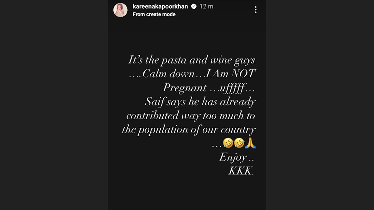 Kareena Kapoor Khan took to Instagram story and quashed rumours about being pregnant again with hubby Saif Ali Khan. She took a hilarious dig to stop the buzz. Taking to her Instagram story she wrote, "It's the pasta and wine guys ..Calm down ... I Am NOT Pregnant ... ufffff ... Saif says he has already contributed way too much to the population of our country. Enjoy .. KKK." Is Kareena Kapoor Khan Pregnant Again? Reports Go Viral That She And Saif Ali Khan Are Expecting Their Second Child After Taimur!