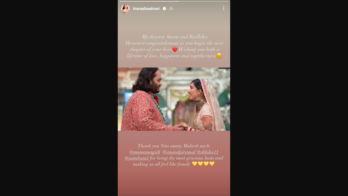 Kiara Advani has sent her warmest congratulations to Anant Ambani and her dear friend Radhika Merchant on their beautiful new chapter together. The actress expressed her joy for the newlyweds and shared her gratitude towards Nita Ambani and Mukesh Ambani for orchestrating such a grand celebration. Kiara praised the Ambani family's efforts in creating a wedding atmosphere that made everyone feel right at home, highlighting the love and joy that filled the occasion. Anant Ambani-Radhika Merchant Sangeet Ceremony: Sidharth Malhotra-Kiara Advani, Varun Dhawan-Natasha Dalal Serve Couple Goals at the Celebrations (Watch Videos).