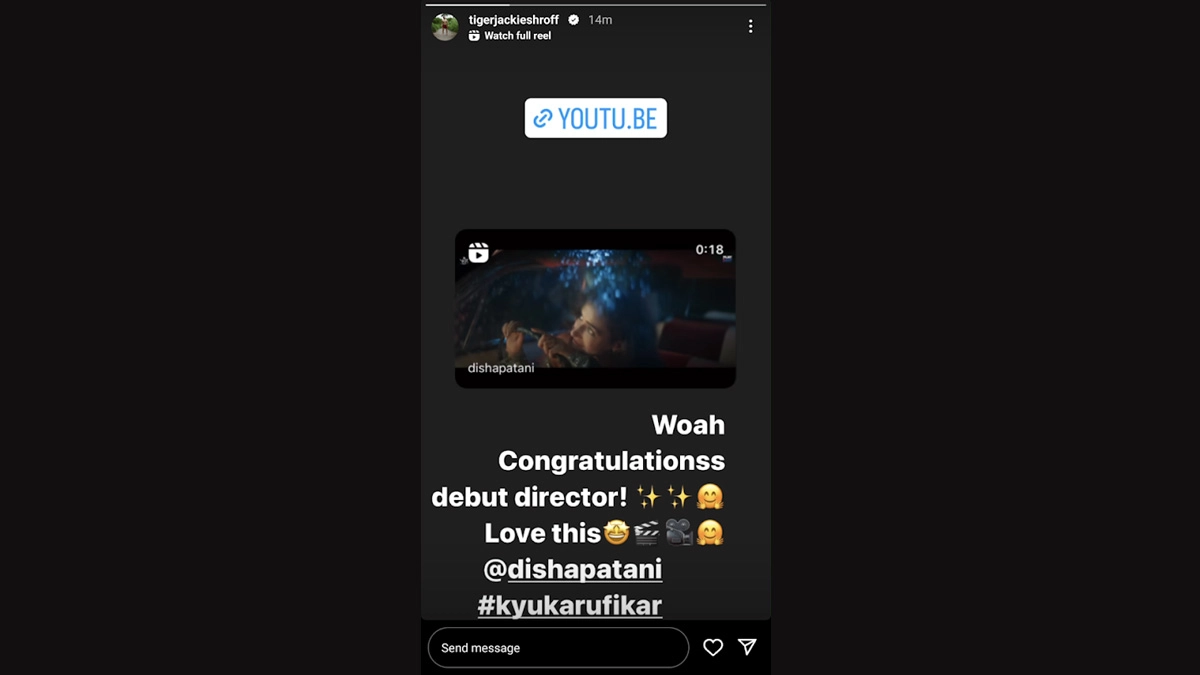 Tiger Shroff's shout out to his rumoured ex-girlfriend Disha Patani came loud and clear. The actor shared a snippet of Disha's new directorial song titled "Kyun Karu Fikar". He wrote on his Instagram story, "Woah Congratulations Debut Director! Love This." Disha Patani and Tiger Shroff frequently trend for their social media exchanges. See what Tiger posted for Disha here. ‘Kyun Karu Fikar’: Disha Patani’s New Track Is a Beautiful Rendition Crooned by Nikhita Gandhi (Watch Video).