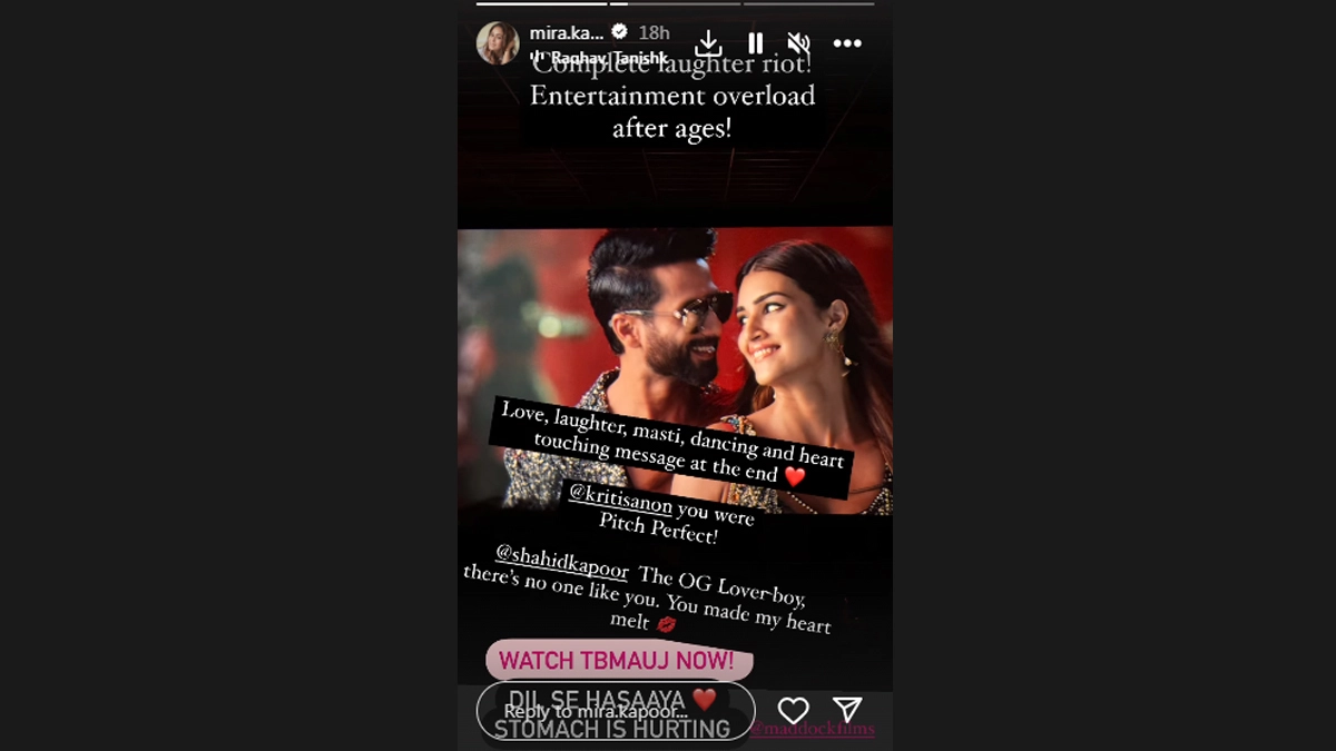 Teri Baaton Mein Aisa Uljha Jiya is currently running in theatres and the sci-fi romantic comedy has opened to mixed response from the audience. However, Mira Rajput has a different take. She has showered praises on the film and hailed it as a ‘complete laughter riot’. Only that, Mira even couldn’t stop praising her hubby’s commendable performance. She labelled him as ‘The OG Lover Boy’. Check out her post below: Teri Baaton Mein Aisa Uljha Jiya Review: Shahid Kapoor and Kriti Sanon’s Sci-Fi Romantic Comedy Receives Negative Response From Critics.