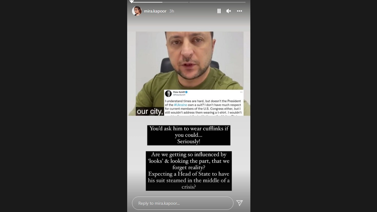 Mira Rajput took to Instagram stories today (March 19) and slammed US financial expert Peter Schiff's tweet which questioned President Volodymyr Zelenskyy's attire during his recent address to the US Congress. Mira shared a pic of the Ukraine President in his green t-shirt and penned, "Are we getting so influenced by 'looks' and looking the part, that we forget reality?" Hilary Duff Slams Russian President Vladimir Putin in an Emotional Post About the Country’s Invasion of Ukraine.