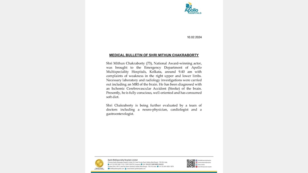 Veteran actor Mithun Chakraborty was admitted to a hospital in Kolkata after he complained of chest pain on February 10. Now, the latest update on the actor's health was shared by Apollo Hospital of Kolkata, where he is currently admitted. Mithun has been diagnosed with an Ischaemic Cerebrovascular Accident (Stroke) of the brain. The post says, "He has been diagnosed with an Ischaemic Cerebrovascular Accident (Stroke) of the brain. Presently, he is fully conscious, well-oriented and has consumed a soft diet." The statement further added that the actor is in the care of several doctors in the hospital. Mithun Chakraborty Rushed to Hospital in Kolkata After Complaining of Chest Pain – Reports.
