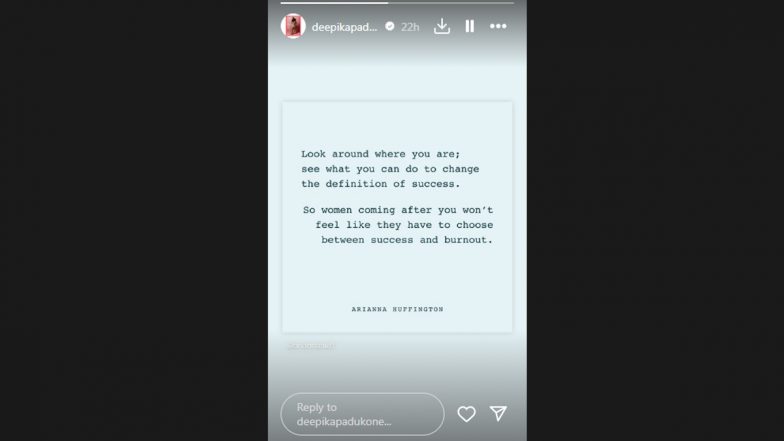 Deepika Padukone, who recently announced her pregnancy with her husband Ranveer Singh, has once again caught everyone's attention with a thought-provoking post on her social media. On March 27, the Bollywood actress shared a quote on her Instagram story about success and burnout. The quote read, "Look around where you are; see what you can do to change the definition of success. So women coming after you won't feel like they have to choose between success and burnout." The post now sparks speculations regarding the actress' career, hinting at a possible hiatus to embrace motherhood. Vin Diesel Surprises Fans by Sharing Old Pic From His India Trip Featuring XXX: Return of Xander Cage Co-Star Deepika Padukone.