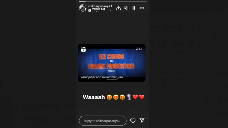 The official trailer for Rajkummar Rao and Janhvi Kapoor's highly anticipated Mr and Mrs Mahi was released on May 12. Just hours after it was released, the actress' rumoured boyfriend, Shikhar Pahariya, took to his social media to react to it. Taking to his Instagram handle, Shikhar Pahariya expressed his enthusiasm for his rumoured girlfriend's upcoming film. Sharing the trailer on his Instagram stories, he wrote, "Waaaah". Directed by Sharan Sharma, Mr and Mrs Mahi will hit the theatres on May 31. Mr and Mrs Mahi Trailer: Rajkummar Rao Coaches Janhvi Kapoor for Cricket Glory in This Thrilling Sports Drama (Watch Video).