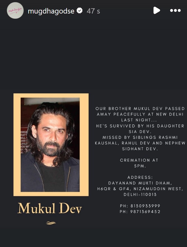 Renowned Bollywood actor Mukul Dev, best known for his roles in films such as Yamla Pagla Deewana, Son of Sardaar, R... Rajkumar, and Omerta, passed away on 23 May in New Delhi after a prolonged illness. He was 54. Mukul, who made his acting debut in the 1996 film Dastak, had a versatile career spanning over two decades. Actress Mugdha Godse, who is in a relationship with Rahul Dev (Mukul’s elder brother), shared the funeral arrangements via her Instagram story. The actor will be cremated today at 5 PM in New Delhi. Mukul Dev Dies: Manoj Bajpayee Condoles Demise of Actor, Says ‘Miss You Meri Jaan, Until We Meet Again’.