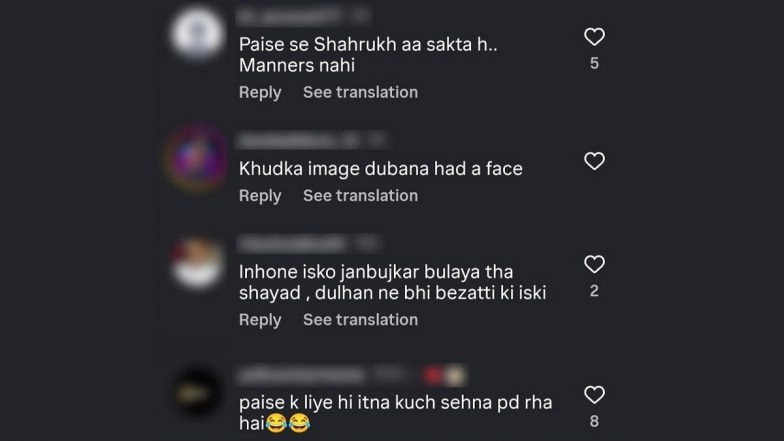 Shah Rukh Khan recently performed at a grand wedding in Delhi. During his performance, the Bollywood superstar received an odd request, and a video capturing the moment has gone viral on the internet. A video shared on Instagram showcased the bride requesting Shah Rukh Khan to reiterate his dialogue "Bolo Zubaan Kesari" from his ad campaign for the pan masala brand Vimal. SRK responded to the request in his signature playful style and said that once you work with a Guthka brand, people never let you forget it. He said, "Har baar jab karta hoon toh paise leta hoon. Papa ko keh dena." (I charge money whenever I do it, so tell your father). However, it seemed like netizens did not like it one bit. They took to the video's comment section to express their thoughts. Some even called out the actor for performing at the wedding. A user wrote, "Paison se Shah Rukh Khan aa sakta hai, manners nahi." Another wrote, "Paison ke lie itna kuch sehna padta hai." ‘Do Bhai Dono Tabahi’: Shah Rukh Khan and Salman Khan Light Up a Wedding With Their Charming Presence, Dance to Iconic ‘Oh Oh Jane Jaana’ Song; Netizens React (Watch Video).