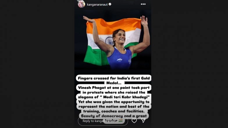 Vinesh Phogat scripted history on Tuesday (August 6) after she became the first Indian wrestler to reach an Olympic final at the ongoing Paris Olympics 2024. Phogat defeated Cuba's Yusneylys Guzman in the semi-final match. The 29-year-old wrestler was also a leading face during the protests against former Wrestling Federation of India chief Brij Bhushan Sharan Singh. Actress-politician Kangana Ranaut took a jibe at the wrestler and credited the country's "democracy" for her victory. Taking to her Instagram stories, the BJP MP wrote, "Fingers crossed for India's first gold medal. Vinesh Phogat at one point took part in protests where she raised the slogans of 'Modi teri khabar khudegi'. Yet she was given the opportunity to represent the nation and best of training, coaches and facilities. Beauty of democracy and a great leader." Vinesh Phogat will face USA's Sarah Hildebrandt in the finals on August 7. Vinesh Phogat Ensures Medal For India As She Enters Women's 50 Kg Freestyle Wrestling Final in Paris Olympics 2024.