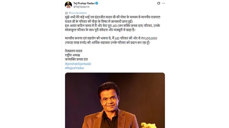 Politician Tej Pratap Yadav has extended financial help to actor-comedian Rajpal Yadav after reports emerged about the actor’s arrest in a cheque bounce case. The Jan Shakti Janata Dal (JJD) president announced assistance of INR 11 lakh, expressing support for Yadav’s family during the ongoing crisis. The case is linked to an old loan taken in 2010, when Rajpal Yadav reportedly borrowed INR 5 crore to finance his directorial film Ata Pata Laapata. After the film failed at the box office, repayment issues led to legal action, with dues later rising to around INR 9 crore. Sharing his thoughts, Tej Pratap Yadav said he learned about the family’s distress through a post by his elder brother and added that he and the entire JJD stand firmly with them in this difficult phase. Rajpal Yadav Chequ Bounce Case: Music Producer Rao Inderjeet Singh Yadav Extends INR 1.11 Crore Financial Help to Actor (Watch Video).