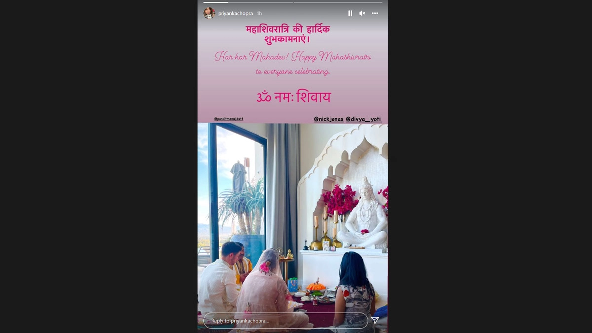 On the auspicious occasion of Maha Shivratri, Priyanka Chopra shared a few stills on Instagram wherein she could be seen celebrating the festival with hubby Nick Jonas. This is the first time the two will be celebrating the special day as parents of a newborn. In the clicks shared, the duo can be seen performing puja in front of a Lord Shiva's idol. Priyanka Chopra And Nick Jonas Spotted Spending Time At A Beach In California, Couple’s Pics Go Viral.